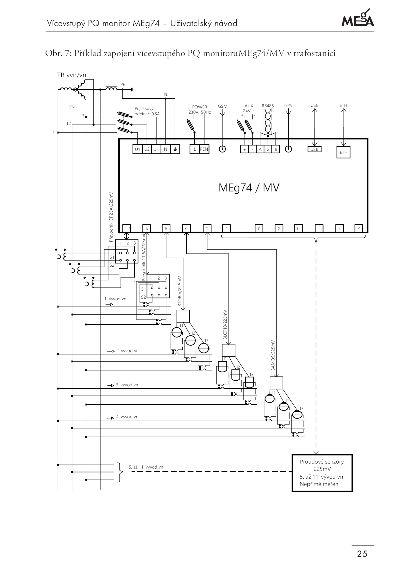 Vícevstupý monitor MEg74 Uživatelský návod 25 Obr. vývod vn 5. vývod vn Proudové senzory 225mV 5. Příklad zapojení vícevstupého monitoruMEg74/MV trafostanici U1 USB ETH I1-I3 K GSM 24V GPS MEg74 MV RS485 ss A Obr. vývod vn 3LCT10/225mV I1 I2 I3 4. 11. vývod vn Nepřímé měření L PEN 230V, 50Hz I1 I3 S2 S1 TR vvn/vn Převodník CT 5A/225mV 3TORm/225mV I1 I2 I3 2.7: Příklad zapojení více vstupového monitoruMEg74/MV trafostanici + - PE N L3 L2 L1 Pojistkový odpínač, 0,5A VN Převodník CT 25A/225mV I1 I3 S2 S1 1. 11. vývod vn 3AMOS/225mV USB ETH AUX POWER . vývod vn I1 I2 I3 3