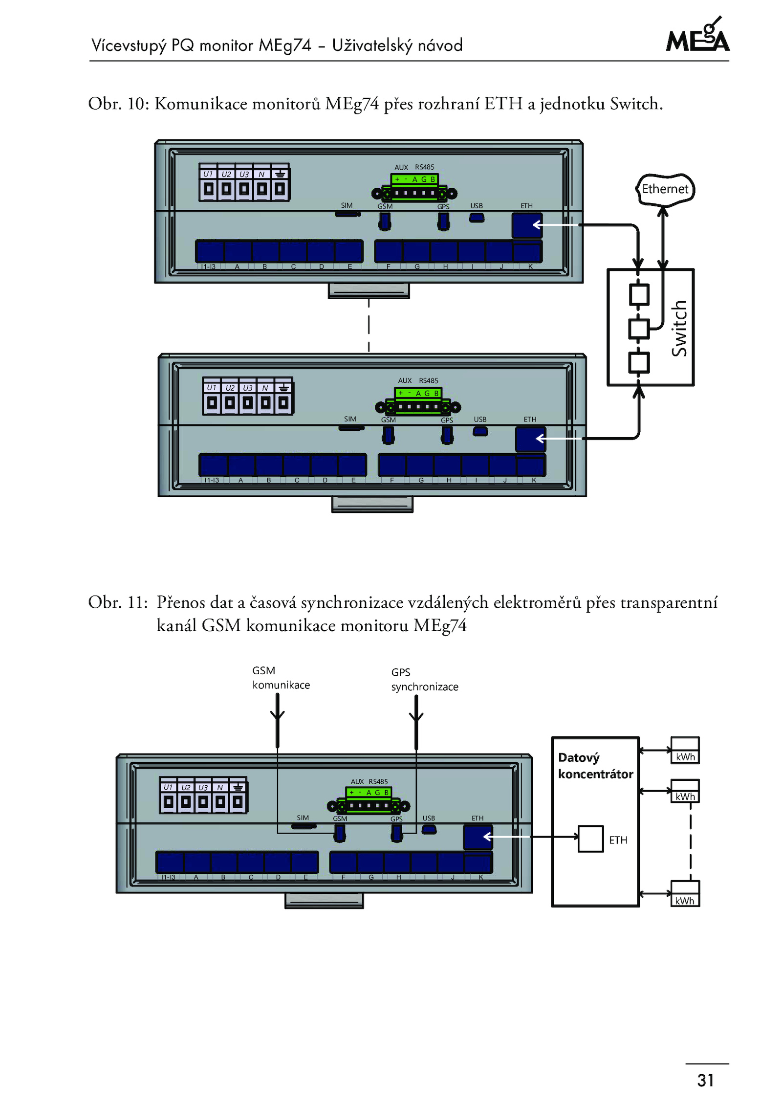 Obr. 10: Komunikace monitorů MEg74 přes rozhraní ETH jednotku Switch