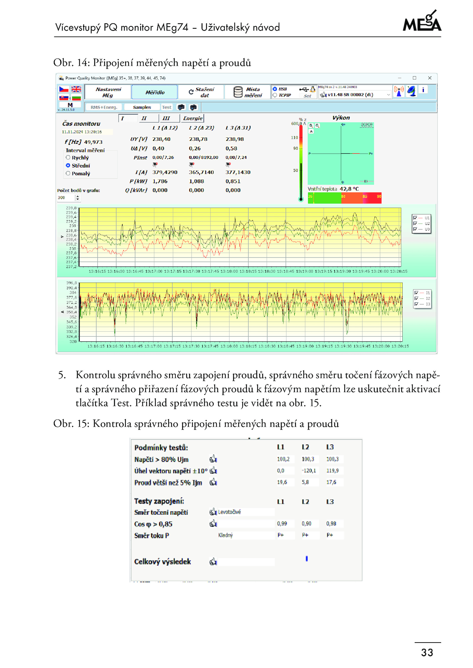 tlačítka Test. 15: Kontrola správného připojení měřených napětí proudů