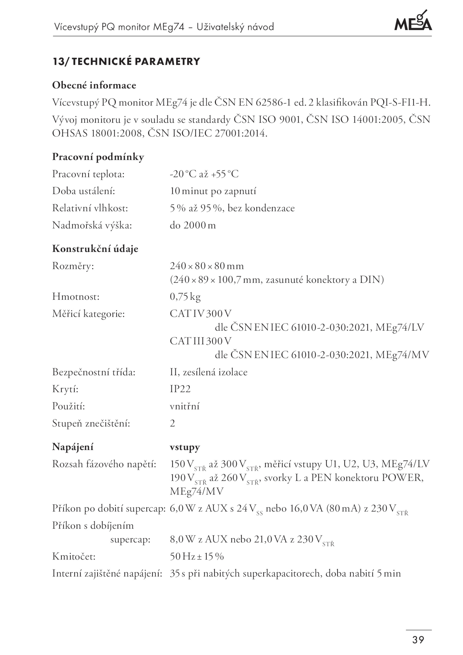 OHSAS 18001:2008, ČSN ISO/IEC 27001:2014.Vícevstupý monitor MEg74 Uživatelský návod