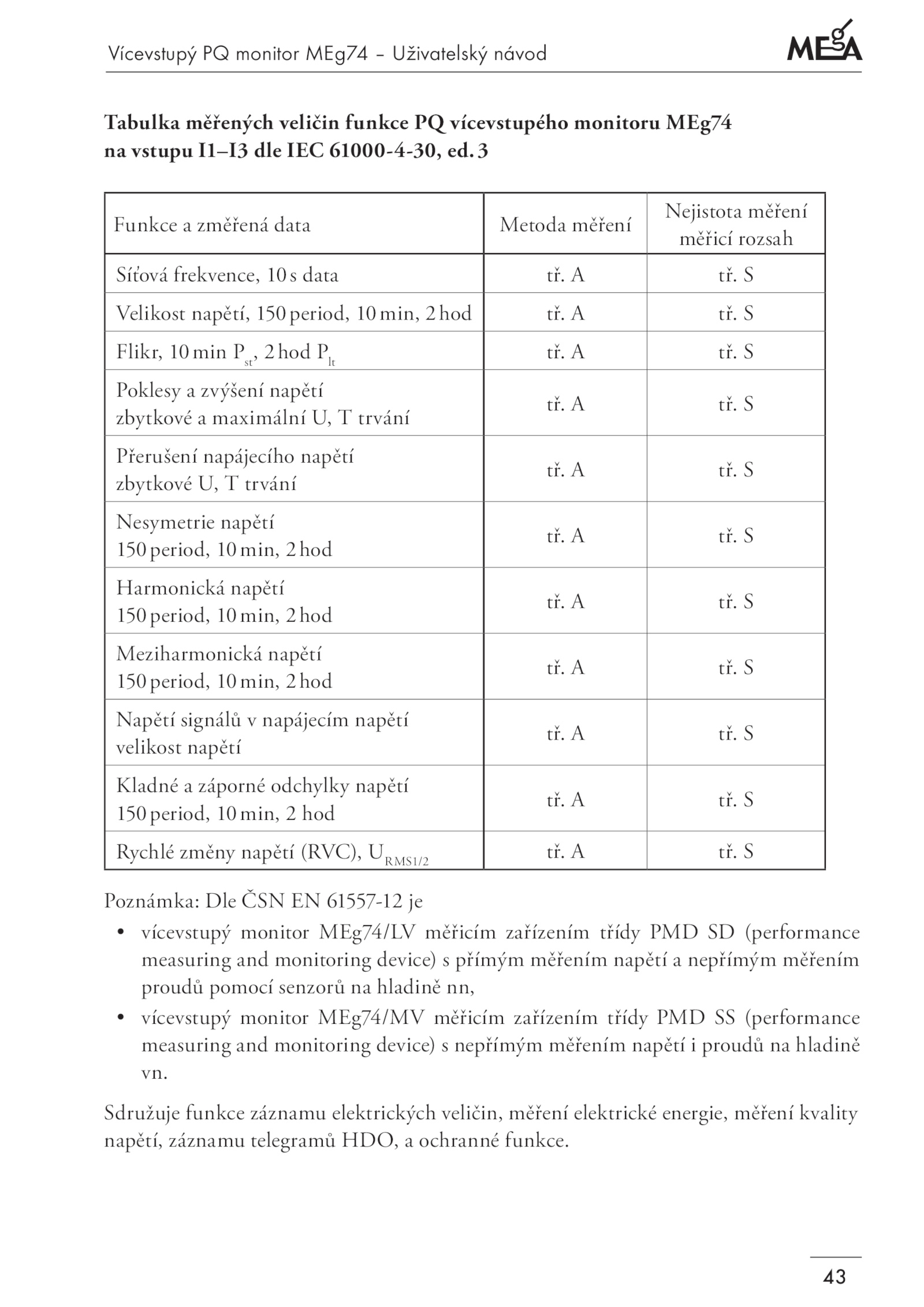 • vícevstupý monitor MEg74/LV měřicím zařízením třídy PMD (performance
