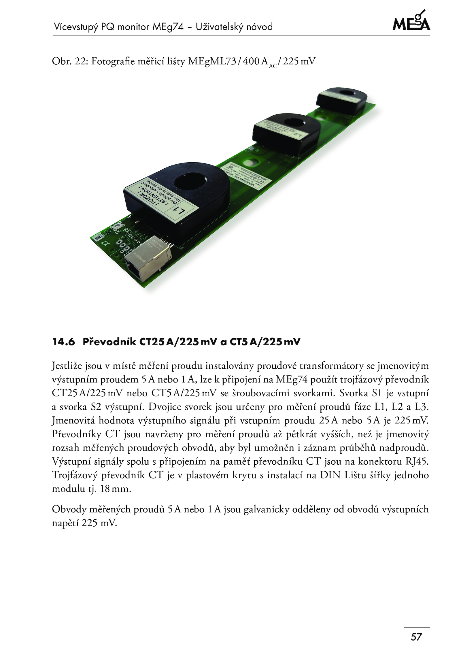 CT25A/225mV nebo CT5A/225mV šroubovacími svorkami.Vícevstupý monitor MEg74 Uživatelský návod