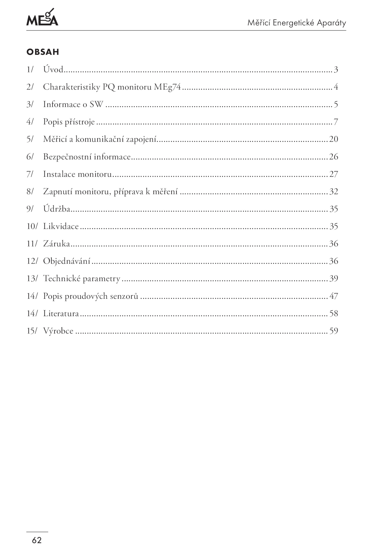 .......................59 ...................................................................................................................................58 15/ Výrobce.....................................................27 8/ Zapnutí monitoru, příprava měření.....................................................................................36 13/ Technické parametry....................................................................................................................47 14/ Literatura...................................................................................32 9/ Údržba.....35 11/ Záruka................................................................................................................................................4 3/ Informace SW.................................................................................................5 4/ Popis přístroje...........................39 14/ Popis proudových senzorů................................36 12/ Objednávání................................................................................................................................................................................................26 7/ Instalace monitoru..........................................................................................................................................................................................................Měřící Energetické Aparáty 62 OBSAH 1/ Úvod...........................20 6/ Bezpečnostní informace....................................................................................................................3 2/ Charakteristiky monitoru MEg74.....................................................35 10/ Likvidace........................................................................................7 5/ Měřicí komunikační zapojení........................................................