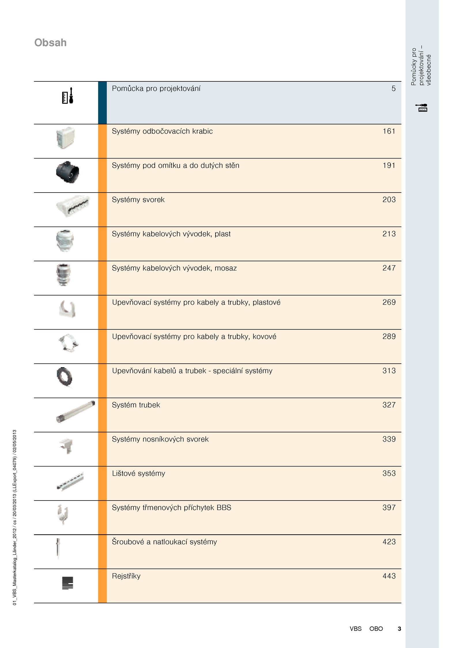 Pomůckypro projektování– všeobecné 01_VBS_Masterkatalog_Länder_2012/cs/20/03/2013(LLExport_04079)/02/05/2013 3OBOVBS Pomůcka pro projektování 5 Systémy odbočovacích krabic 161 Systémy pod omítku dutých stěn 191 Systémy svorek 203 Systémy kabelových vývodek, plast 213 Systémy kabelových vývodek, mosaz 247 Upevňovací systémy pro kabely trubky, plastové 269 Upevňovací systémy pro kabely trubky, kovové 289 Upevňování kabelů trubek speciální systémy 313 Systém trubek 327 Systémy nosníkových svorek 339 Lištové systémy 353 Systémy třmenových příchytek BBS 397 Šroubové natloukací systémy 423 Rejstříky 443 Obsah