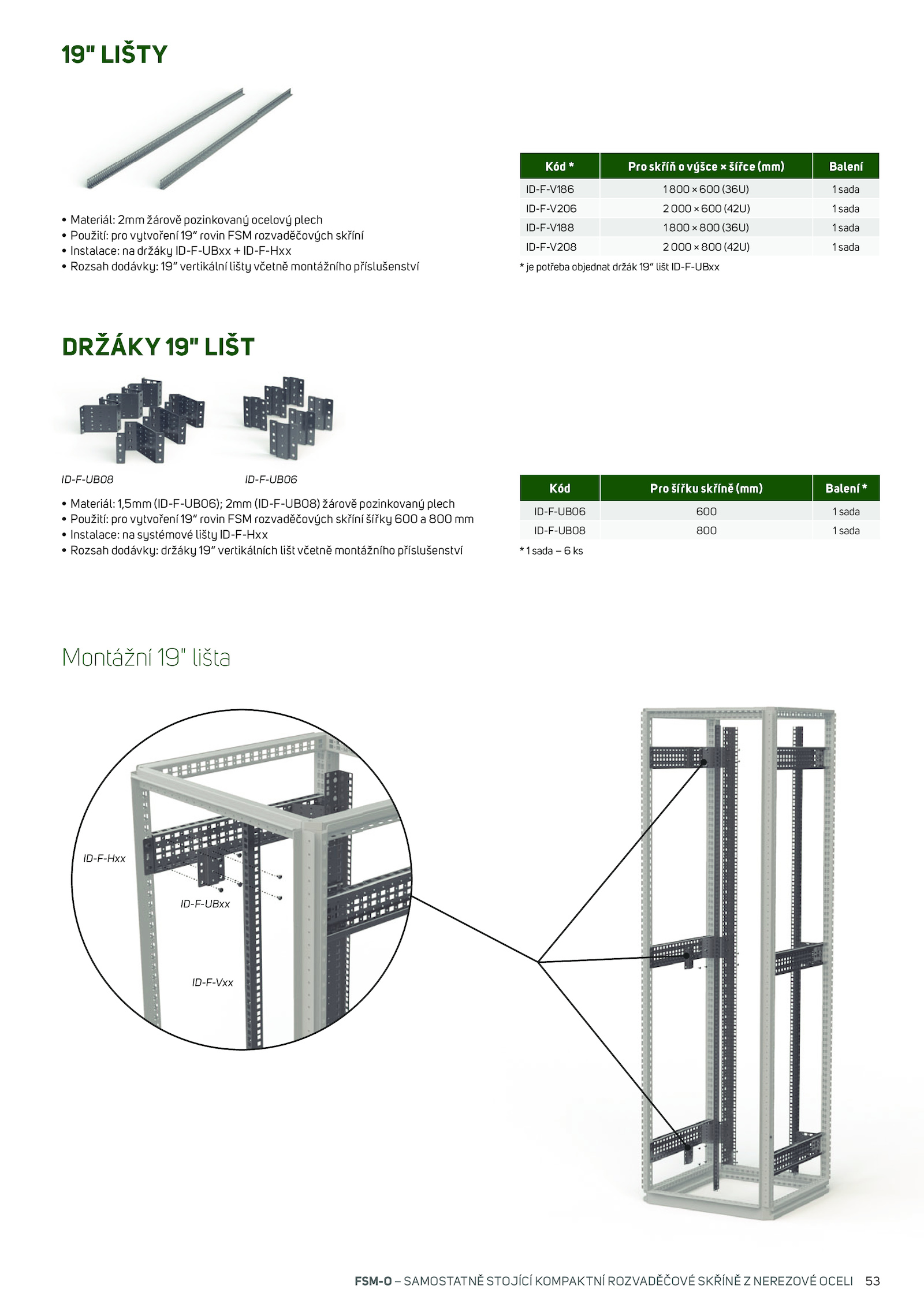 ID-F-UB08 ID-F-Hxx ID-F-UBxx ID-F-Vxx ID-F-UB06 FSM-O SAMOSTATNĚ STOJÍCÍ KOMPAKTNÍ ROZVADĚČOVÉ SKŘÍNĚ NEREZOVÉ OCELI 53 Kód Pro šířku skříně (mm) Balení * ID-F-UB06 600 sada ID-F-UB08 800 sada * sada ks Kód Pro skříň výšce šířce (mm) Balení ID-F-V186 800 600 (36U) sada ID-F-V206 000 600 (42U) sada ID-F-V188 800 800 (36U) sada ID-F-V208 000 800 (42U) sada * potřeba objednat držák 19“ lišt ID-F-UBxx 19" LIŠTY DRŽÁKY 19" LIŠT • Materiál: 2mm žárově pozinkovaný ocelový plech • Použití: pro vytvoření 19” rovin FSM rozvaděčových skříní • Instalace: držáky ID-F-UBxx ID-F-Hxx • Rozsah dodávky: 19” vertikální lišty včetně montážního příslušenství • Materiál: 1,5mm (ID-F-UB06); 2mm (ID-F-UB08) žárově pozinkovaný plech • Použití: pro vytvoření 19” rovin FSM rozvaděčových skříní šířky 600 800 mm • Instalace: systémové lišty ID-F-Hxx • Rozsah dodávky: držáky 19” vertikálních lišt včetně montážního příslušenství Montážní 19" lišta