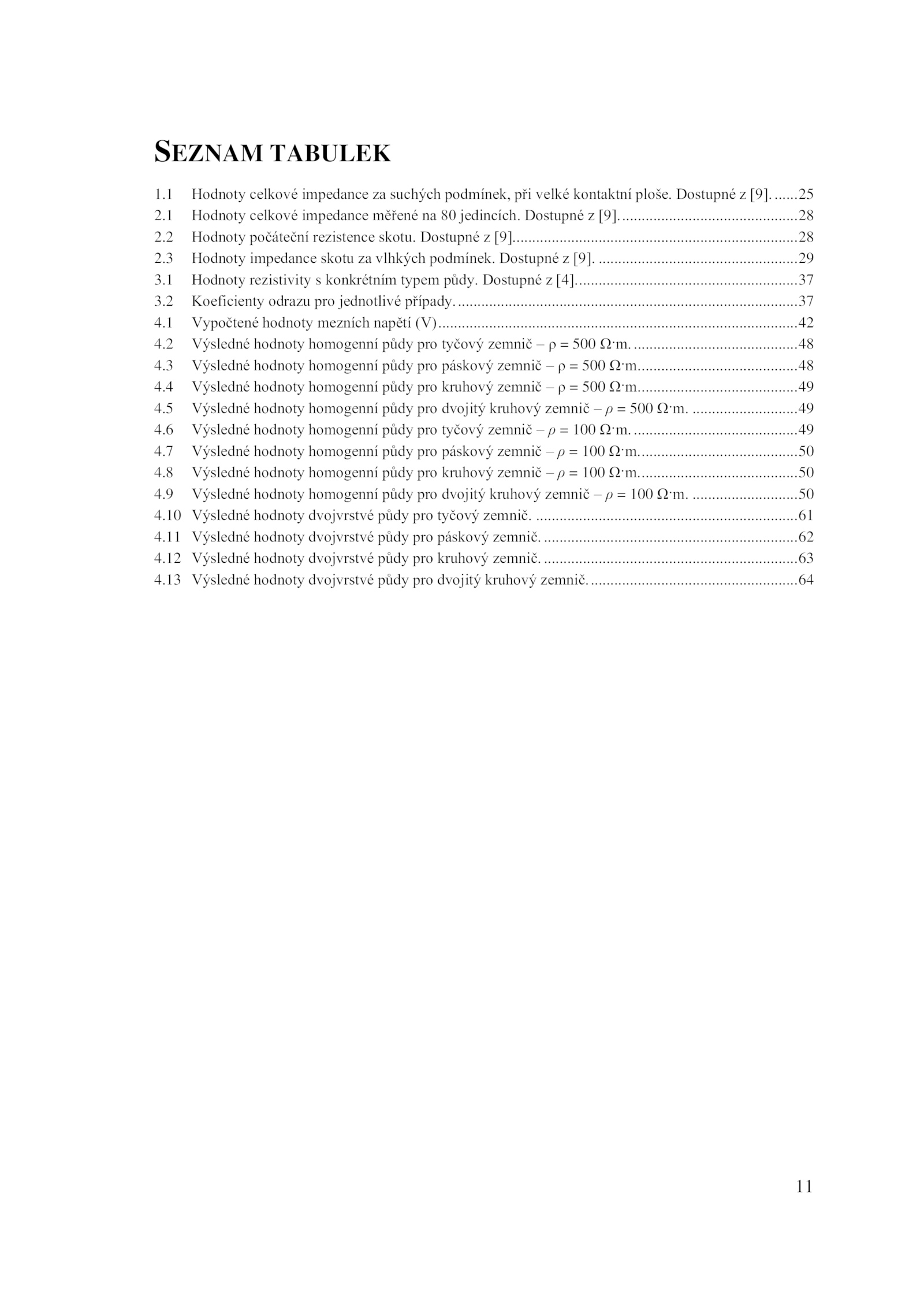1.1 Hodnoty celkové impedance měřené jedincích.........9 Výsledné hodnoty homogenní půdy pro dvojitý kruhový zemnič 100 Ω·m....3 Výsledné hodnoty homogenní půdy pro páskový zemnič 500 Ω·m.........................1 Vypočtené hodnoty mezních napětí (V)............. ...49