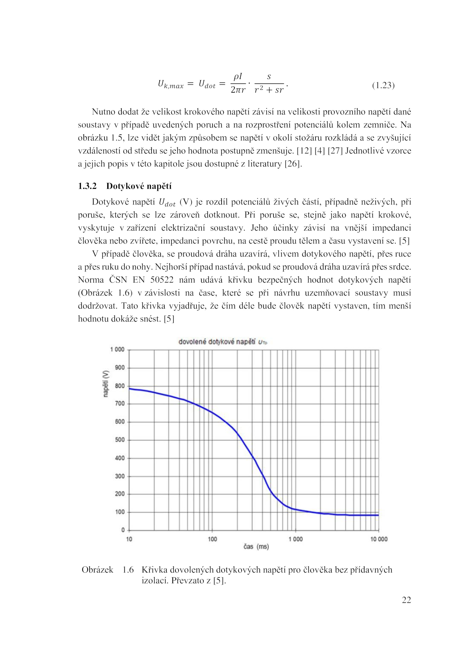 Norma ČSN 50522 nám udává křivku bezpečných hodnot dotykových napětí