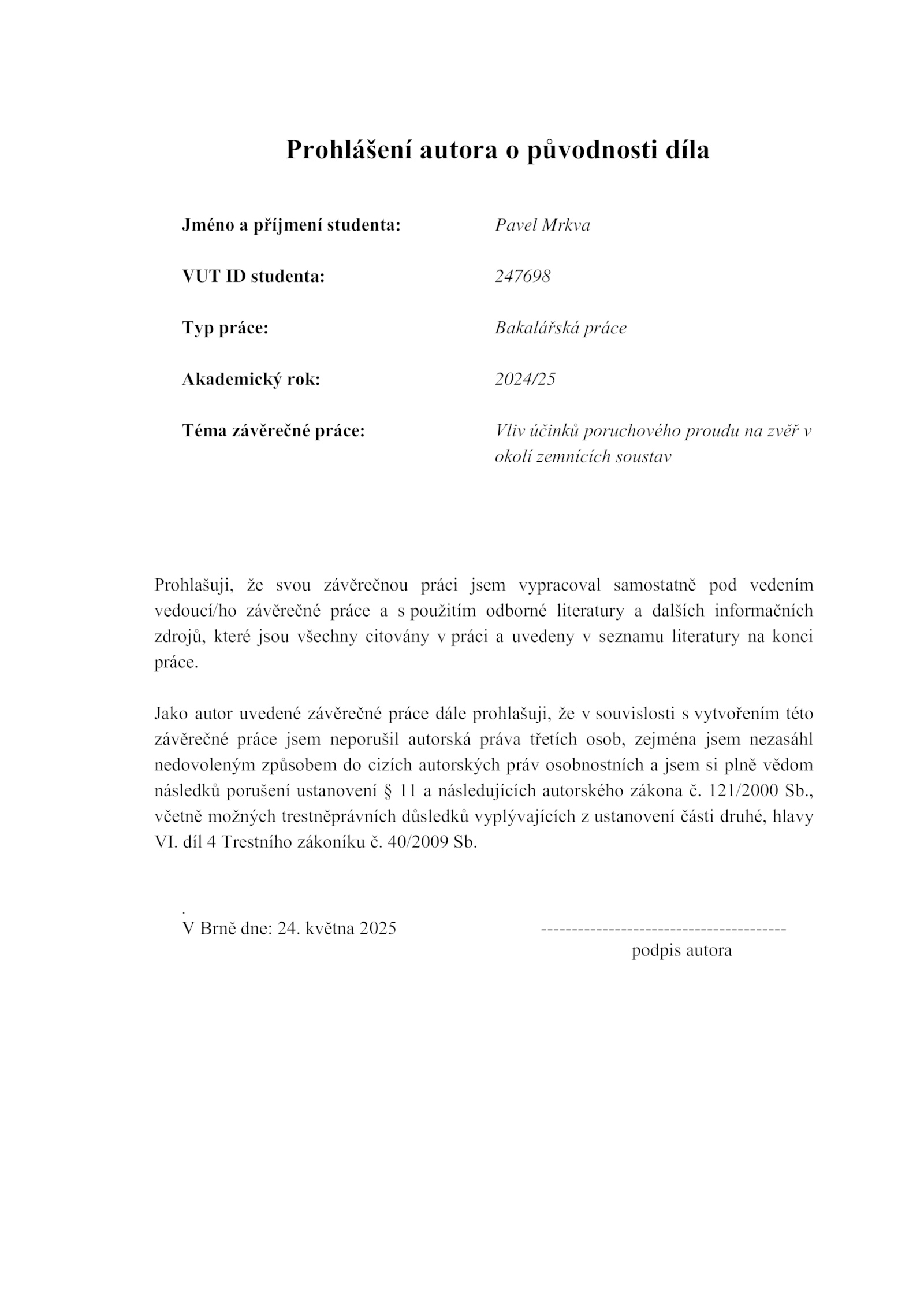 Téma závěrečné práce: Vliv účinků poruchového proudu zvěř v