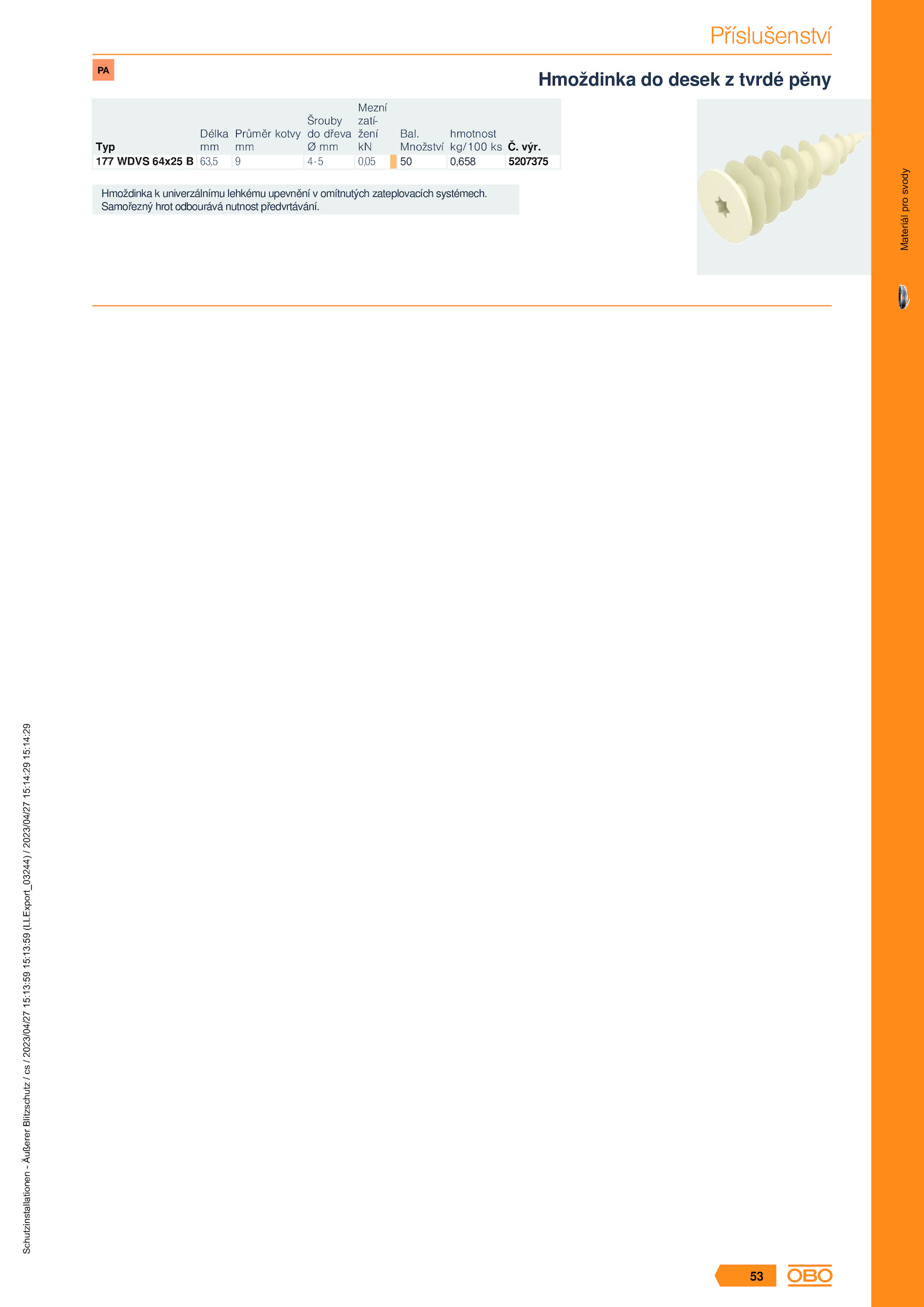 5207375 Bal. Množství 50 Schutzinstallationen - Äußerer Blitzschutz / cs / 2023/04/27 15:13:59 15:13:59 (LLExport_03244) / 2023/04/27 15:14:29 15:14:29 Materiál pro svody 53 . Samořezný hrot odbourává nutnost předvrtávání.Příslušenství Hmoždinka desek tvrdé pěny Hmoždinka univerzálnímu lehkému upevnění omítnutých zateplovacích systémech. 63,5 4-5 0,05 Typ 177 WDVS 64x25 B Délka mm Průměr kotvy mm Šrouby do dřeva Ø mm Mezní zatí- žení kN hmotnost kg/100 ks 0,658 Č. výr