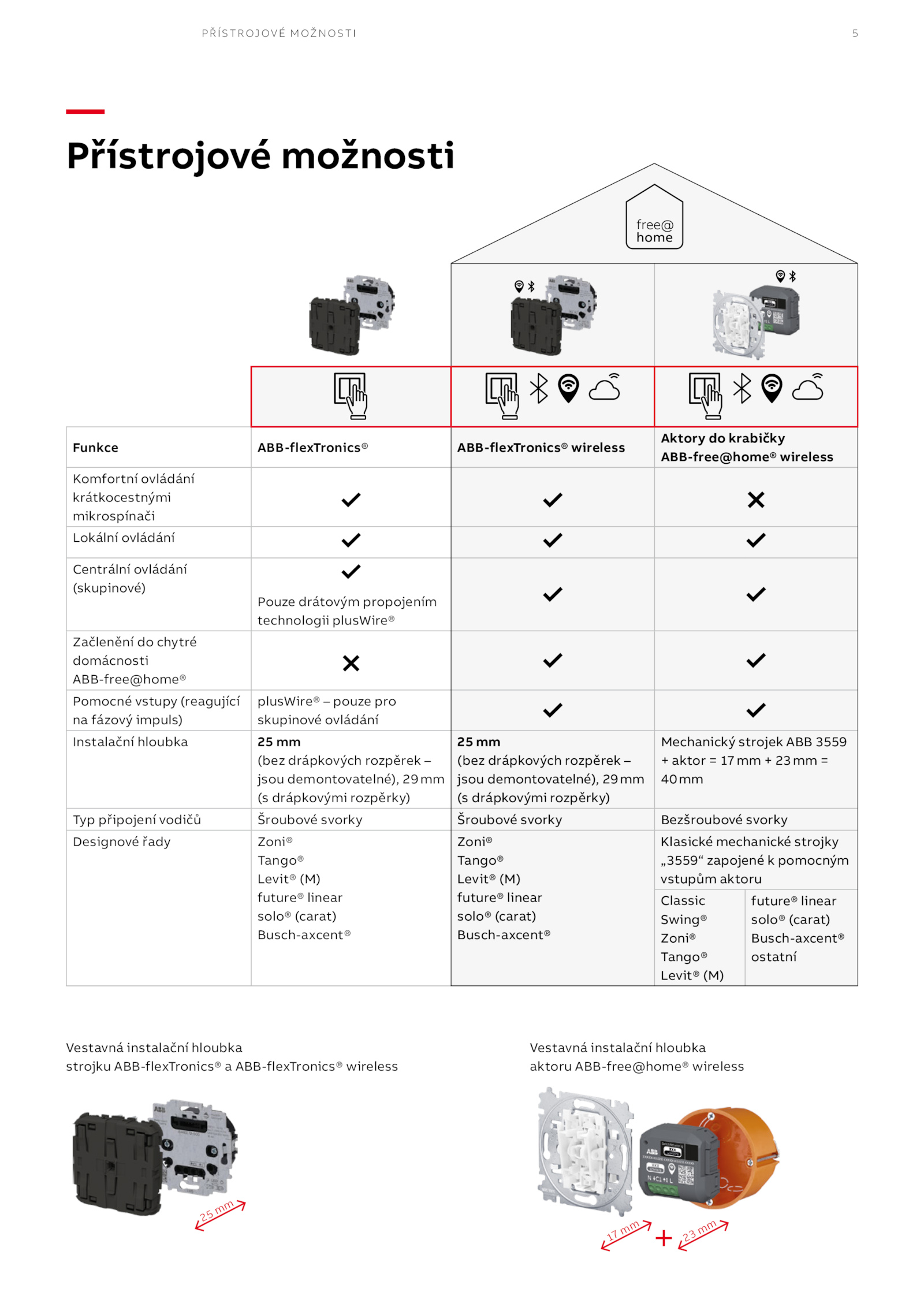 5 PŘÍSTROJOVÉ MOŽNOSTI — Přístrojové možnosti Vestavná instalační hloubka strojku ABB-flexTronics® ABB-flexTronics® wireless 25 mm 17 mm 23 mm Vestavná instalační hloubka aktoru ABB-free@home® wireless Funkce ABB-flexTronics® ABB-flexTronics® wireless Aktory krabičky ABB-free@home® wireless Komfortní ovládání krátkocestnými mikrospínači Lokální ovládání Centrální ovládání (skupinové) Pouze drátovým propojením technologii plusWire® Začlenění chytré domácnosti ABB-free@home® Pomocné vstupy (reagující na fázový impuls) plusWire® pouze pro skupinové ovládání Instalační hloubka mm (bez drápkových rozpěrek – jsou demontovatelné), 29mm (s drápkovými rozpěrky) 25 mm (bez drápkových rozpěrek – jsou demontovatelné), 29mm (s drápkovými rozpěrky) Mechanický strojek ABB 3559 + aktor 17mm 23mm = 40mm Typ připojení vodičů Šroubové svorky Šroubové svorky Bezšroubové svorky Designové řady Zoni® Tango® Levit® (M) future® linear solo® (carat) Busch-axcent® Zoni® Tango® Levit® (M) future® linear solo® (carat) Busch-axcent® Klasické mechanické strojky „3559“ zapojené pomocným vstupům aktoru Classic Swing® Zoni® Tango® Levit® (M) future® linear solo® (carat) Busch-axcent® ostatní