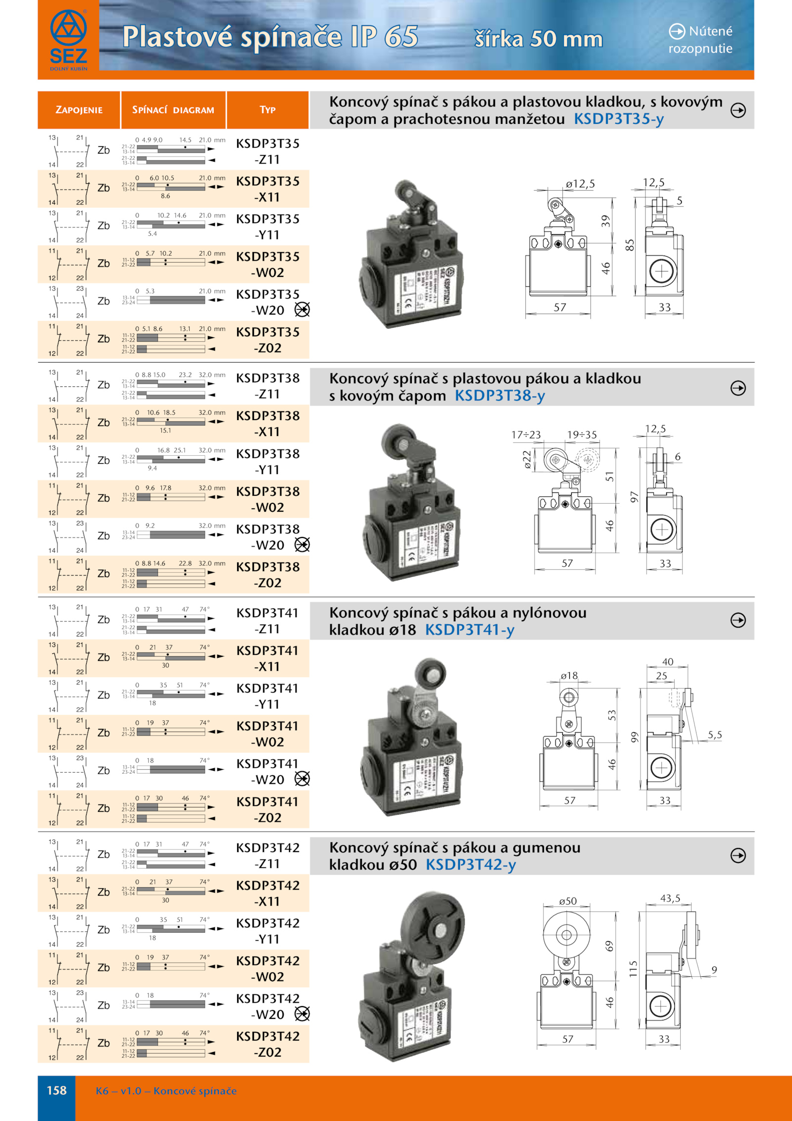 5 0 21-22 13-14 21-22 13-14 21.1 0 11-12 21-22 11-12 21-22 21.8 KSDP3T38 -Z02 31 47 0 21-22 13-14 21-22 13-14 74° 17 KSDP3T41 -Z11 21 37 0 21-22 13-14 74° 30 KSDP3T41 -X11 35 51 0 21-22 13-14 74° 18 KSDP3T41 -Y11 19 37 0 11-12 21-22 74° KSDP3T41 -W02 18 0 13-14 23-24 74° KSDP3T41 -W20 30 46 0 11-12 21-22 11-12 21-22 74° 17 KSDP3T41 -Z02 31 47 0 21-22 13-14 21-22 13-14 74° 17 KSDP3T42 -Z11 21 37 0 21-22 13-14 74° 30 KSDP3T42 -X11 35 51 0 21-22 13-14 74° 18 KSDP3T42 -Y11 19 37 0 11-12 21-22 74° KSDP3T42 -W02 18 0 13-14 23-24 74° KSDP3T42 -W20 30 46 0 11-12 21-22 11-12 21-22 74° 17 KSDP3T42 -Z02 57 39 46 85 12,5 5 33 ø12,5 57 51 46 97 12,5 17÷23 19÷35 6 33 ø22 57 53 46 99 40 25 5,5 33 ø18 57 69 46 115 43,5 9 33 ø50 Plastové spínače šírka Nútené rozopnutie Koncový spínač pákou plastovou kladkou, kovovým čapom prachotesnou manžetou KSDP3T35-y Koncový spínač plastovou pákou kladkou s kovoým čapom KSDP3T38-y Koncový spínač pákou nylónovou kladkou Ø18 KSDP3T41-y Koncový spínač pákou gumenou kladkou Ø50 KSDP3T42-y dolný kubín .8 KSDP3T38 -Z11 10.1 0 21-22 13-14 32.6 13.8 0 11-12 21-22 11-12 21-22 32.6 17.0 mm 8.6 22.0 mm 8.0 Koncové spínače ZapoJenie Spínací diaGram Typ 9.2 0 21-22 13-14 21-22 13-14 32.1 KSDP3T35 -Z02 15.6 KSDP3T35 -X11 10.0 mm KSDP3T35 -W20 8.158 v1.8 0 11-12 21-22 32.5 0 21-22 13-14 32.0 mm 5.0 mm KSDP3T35 -W02 5.5 0 21-22 13-14 21.0 mm 9.2 14.0 mm 15.6 18.0 23.7 10.9 KSDP3T35 -Z11 6.6 0 21-22 13-14 21.4 KSDP3T35 -Y11 5.0 mm 4.1 KSDP3T38 -X11 16.0 mm KSDP3T38 -W02 9.2 0 13-14 23-24 32.0 10.8 25.0 mm 5.4 KSDP3T38 -Y11 9.0 14.0 mm KSDP3T38 -W20 14.3 0 13-14 23-24 21.0 mm 8.2 0 11-12 21-22 21