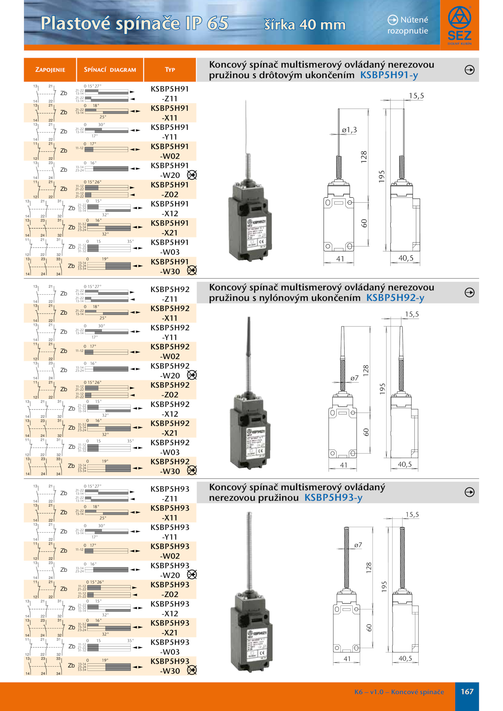 0 Koncové spínače ZapoJenie Spínací diaGram Typ 27° 0 21-22 13-14 21-22 13-14 15° KSBP5H91 -Z11 18° 0 21-22 13-14 25° KSBP5H91 -X11 30° 0 21-22 13-14 17° KSBP5H91 -Y11 17° 0 11-12 KSBP5H91 -W02 16° 0 13-14 23-24 KSBP5H91 -W20 26° 0 11-12 21-22 11-12 21-22 15° KSBP5H91 -Z02 15° 0 21-22 31-32 32° 13-14 KSBP5H91 -X12 16° 0 31-32 13-14 32° 23-24 KSBP5H91 -X21 15 0 11-12 21-22 35° 31-32 KSBP5H91 -W03 19° 0 13-14 23-24 33-34 KSBP5H91 -W30 27° 0 21-22 13-14 21-22 13-14 15° KSBP5H93 -Z11 18° 0 21-22 13-14 25° KSBP5H93 -X11 30° 0 21-22 13-14 17° KSBP5H93 -Y11 17° 0 11-12 KSBP5H93 -W02 16° 0 13-14 23-24 KSBP5H93 -W20 26° 0 11-12 21-22 11-12 21-22 15° KSBP5H93 -Z02 15° 0 21-22 31-32 32° 13-14 KSBP5H93 -X12 16° 0 31-32 13-14 32° 23-24 KSBP5H93 -X21 15 0 11-12 21-22 35° 31-32 KSBP5H93 -W03 19° 0 13-14 23-24 33-34 KSBP5H93 -W30 27° 0 21-22 13-14 21-22 13-14 15° KSBP5H92 -Z11 18° 0 21-22 13-14 25° KSBP5H92 -X11 30° 0 21-22 13-14 17° KSBP5H92 -Y11 17° 0 11-12 KSBP5H92 -W02 16° 0 13-14 23-24 KSBP5H92 -W20 26° 0 11-12 21-22 11-12 21-22 15° KSBP5H92 -Z02 15° 0 21-22 31-32 32° 13-14 KSBP5H92 -X12 16° 0 31-32 13-14 32° 23-24 KSBP5H92 -X21 15 0 11-12 21-22 35° 31-32 KSBP5H92 -W03 19° 0 13-14 23-24 33-34 KSBP5H92 -W30 41 15,5 128 195 60 40,5 ø1,3 41 15,5 128 195 60 40,5 ø7 41 15,5 128 195 60 40,5 ø7 Plastové spínače šírka Nútené rozopnutie Koncový spínač multismerový ovládaný nerezovou pružinou drôtovým ukončením KSBP5H91-y Koncový spínač multismerový ovládaný nerezovou pružinou nylónovým ukončením KSBP5H92-y Koncový spínač multismerový ovládaný nerezovou pružinou KSBP5H93-y dolný kubín .167 K6 v1