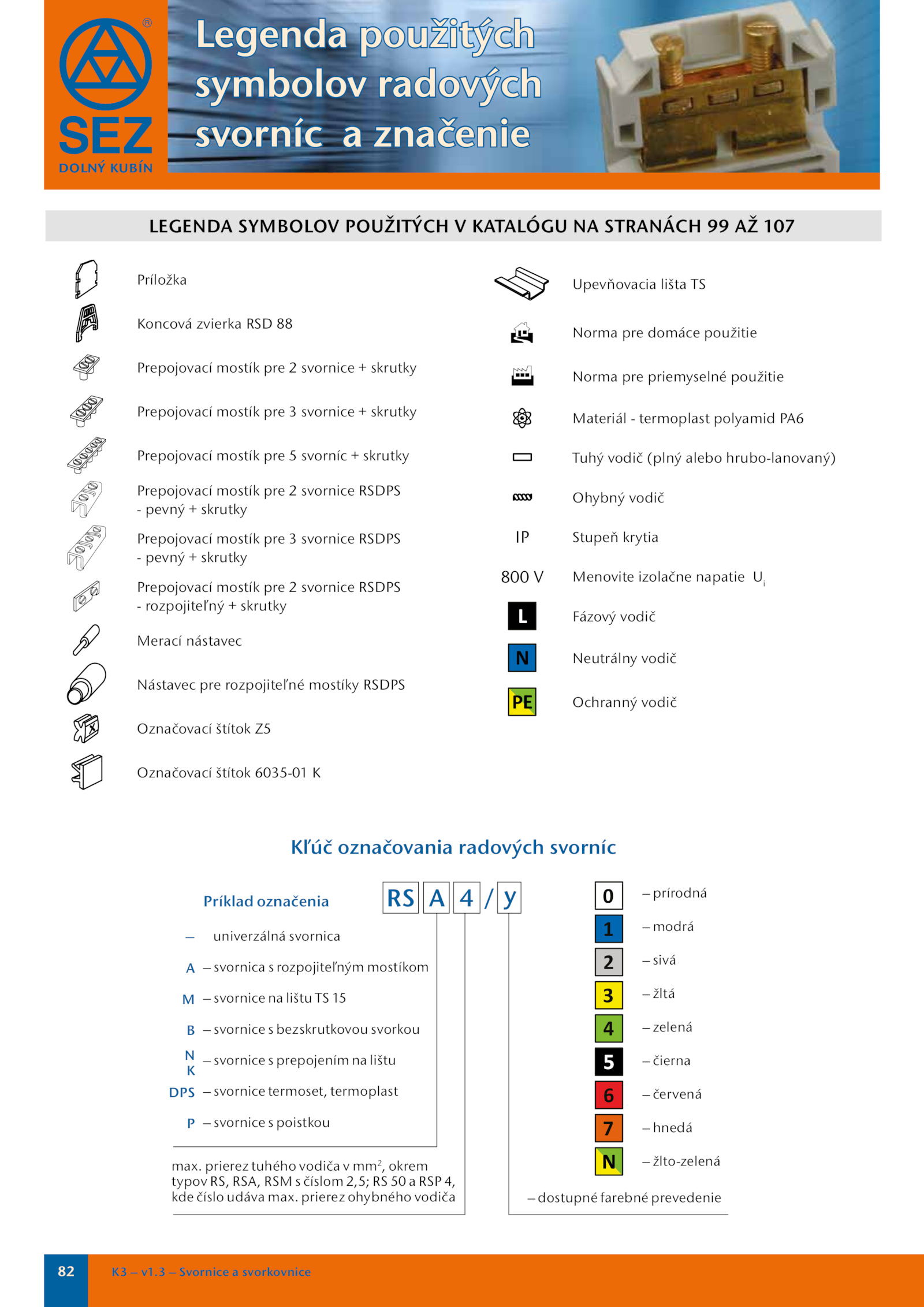 prierez ohybného vodiča ― A M B N K DPS P – dostupné farebné prevedenie – prírodná – modrá – sivá – žltá – zelená – čierna – červená – hnedá – žlto-zelená Kľúč označovania radových svorníc LEGENDA SYMBOLOV POUŽITÝCH KATALÓGU STRANÁCH 107 dolný kubín . prierez tuhého vodiča mm2 , okrem typov RS, RSA, RSM číslom 2,5; RSP 4, kde číslo udáva max.v1.3 Svornice svorkovnice Príložka Koncová zvierka RSD 88 Prepojovací mostík pre svornice skrutky Prepojovací mostík pre svornice skrutky Prepojovací mostík pre svorníc skrutky Prepojovací mostík pre svornice RSDPS - pevný skrutky Prepojovací mostík pre svornice RSDPS - pevný skrutky Prepojovací mostík pre svornice RSDPS - rozpojiteľný skrutky Merací nástavec Nástavec pre rozpojiteľné mostíky RSDPS Označovací štítok Z5 Označovací štítok 6035-01 K Upevňovacia lišta TS Norma pre domáce použitie Norma pre priemyselné použitie Materiál termoplast polyamid PA6 Tuhý vodič (plný alebo hrubo-lanovaný) Ohybný vodič IP Stupeň krytia 800 Menovite izolačne napatie Ui L Fázový vodič N Neutrálny vodič PE Ochranný vodič 1 2 3 4 6 7 0 Legenda použitých symbolov radových svorníc značenie RS y Príklad označenia univerzálná svornica – svornica rozpojiteľným mostíkom – svornice lištu 15 – svornice bezskrutkovou svorkou – svornice prepojením lištu – svornice termoset, termoplast – svornice poistkou max