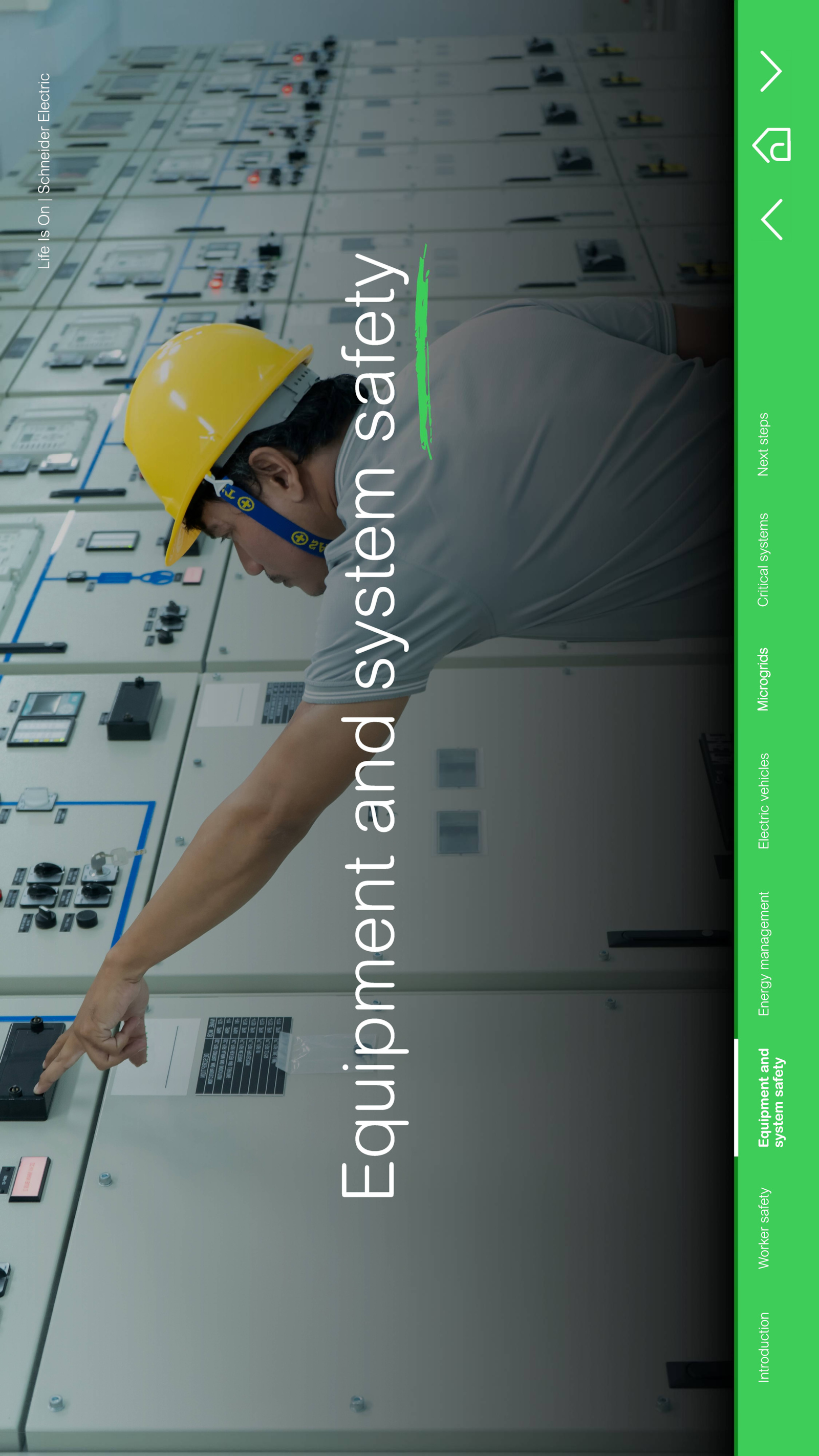 Life Is On Schneider Electric CO Introduction Worker safety Equipment and Energy management Electric vehicles Microgrids Critical systems Next steps system safety
