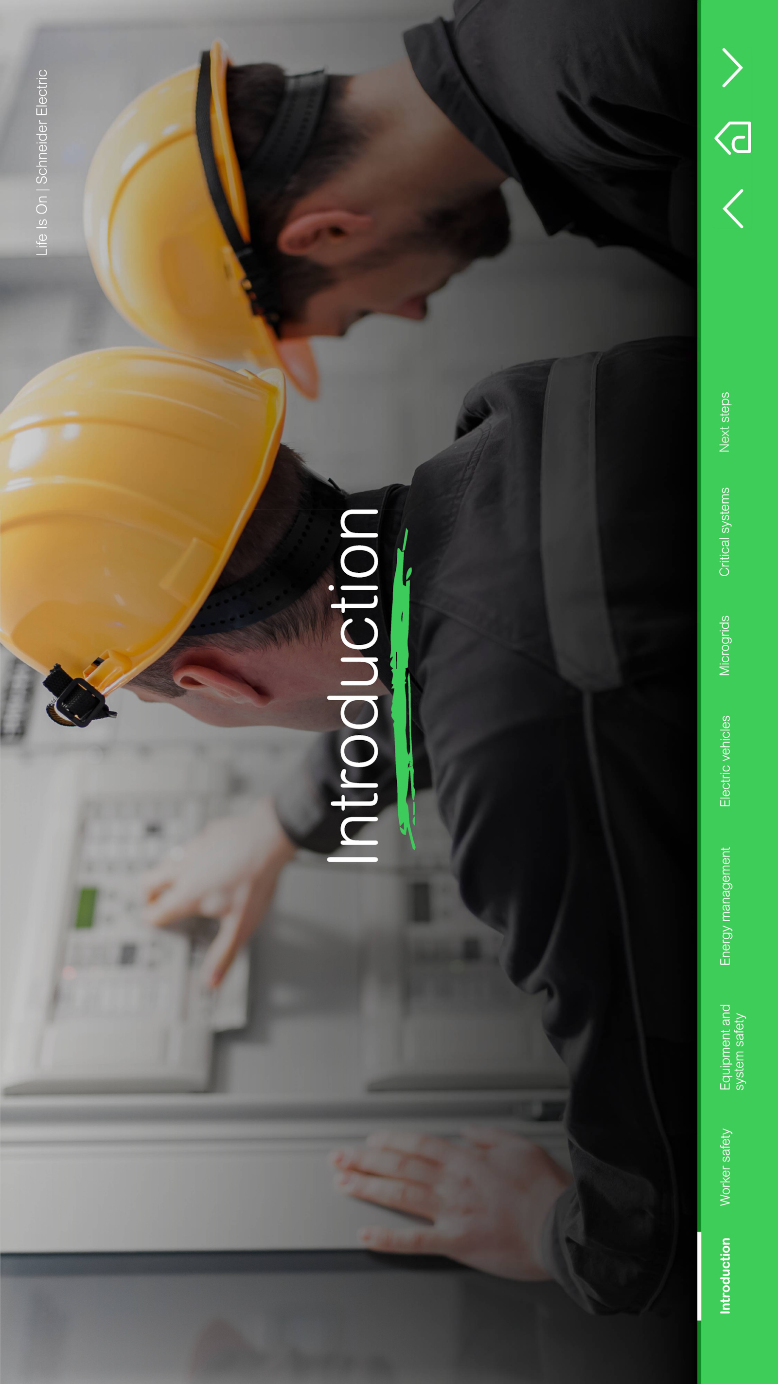 Life Is On Schneider Electric (Z) Q O GO Introduction Worker safety Equipment and Energy management Electric vehicles Microgrids Critical systems system safety