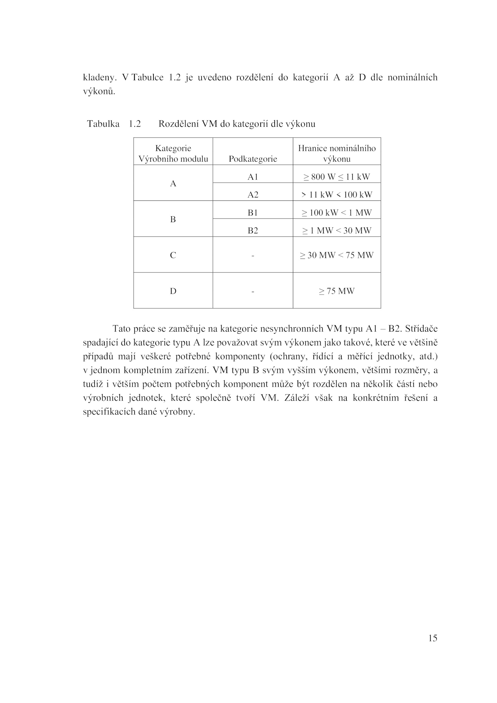 výrobních jednotek, které společně tvoří VM.2 Rozdělení kategorií dle výkonu