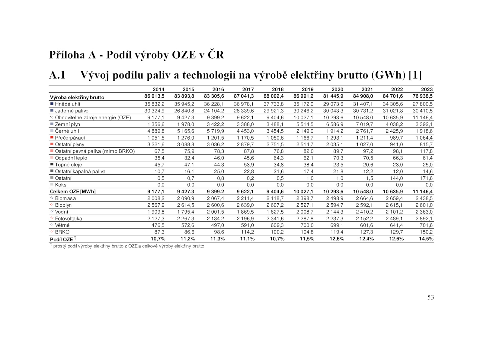 A.1 Vývoj podílu paliv technologií výrobě elektřiny brutto (GWh) [1]