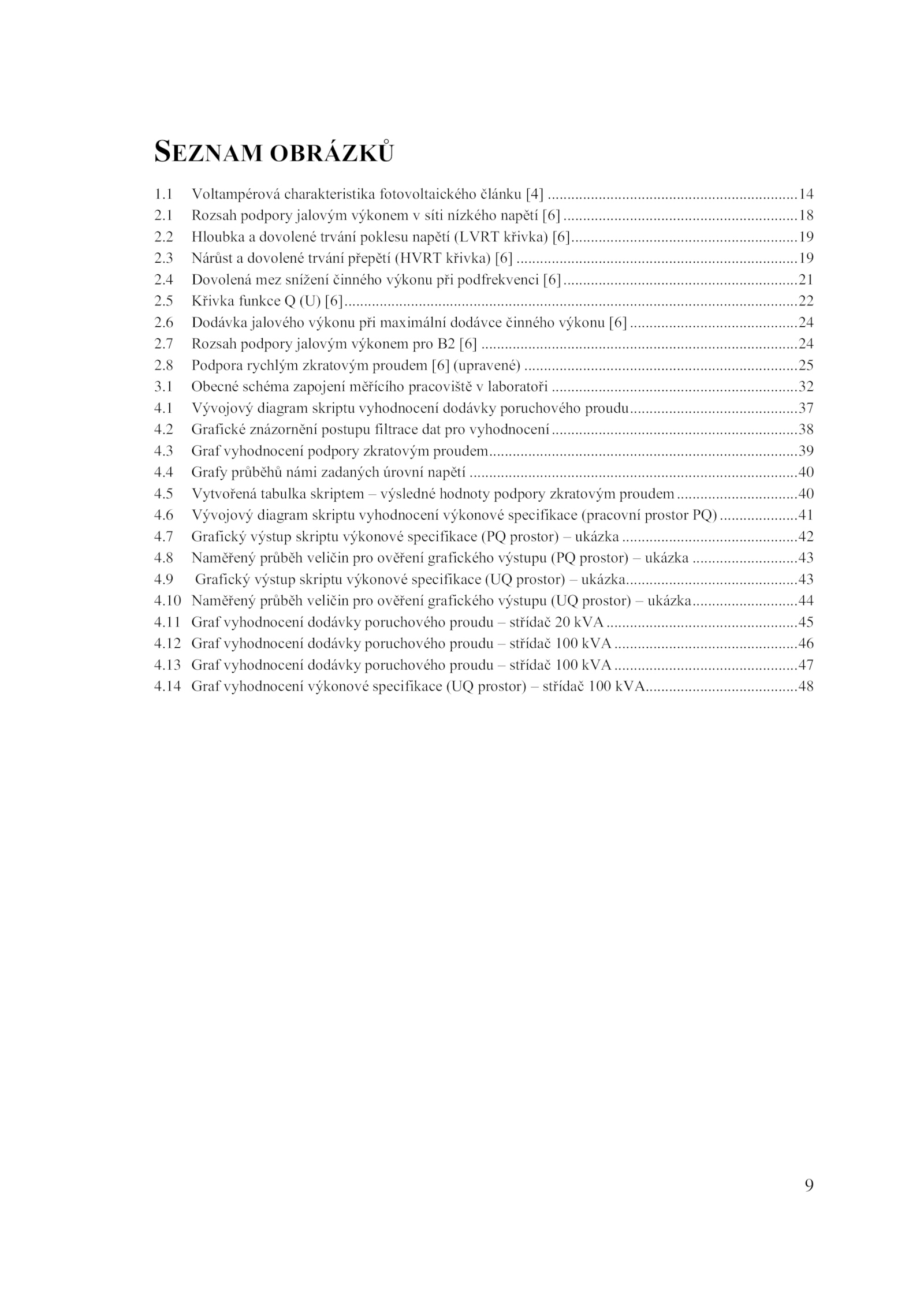 ..43 4.............................................5 Vytvořená tabulka skriptem výsledné hodnoty podpory zkratovým proudem......37 4......................3 Nárůst dovolené trvání přepětí (HVRT křivka) [6] ...........................................13 Graf vyhodnocení dodávky poruchového proudu střídač 100 kVA.................................................7 Grafický výstup skriptu výkonové specifikace (PQ prostor) ukázka ....................................................................32 4............1 Voltampérová charakteristika fotovoltaického článku [4] .................4 Dovolená mez snížení činného výkonu při podfrekvenci [6]....38 4......................................14 2........................19 2............24 2......................................4 Grafy průběhů námi zadaných úrovní napětí .....................................................................................................................................................................................8 Naměřený průběh veličin pro ověření grafického výstupu (PQ prostor) ukázka ........................43 4...........21 2..46 4..............2 Hloubka dovolené trvání poklesu napětí (LVRT křivka) [6].................................................................25 3....................................2 Grafické znázornění postupu filtrace dat pro vyhodnocení...............................44 4......................................................................................................18 2.3 Graf vyhodnocení podpory zkratovým proudem........................41 4.........................22 2.....47 4.........................42 4..........................9 Grafický výstup skriptu výkonové specifikace (UQ prostor) ukázka.........................40 4...............11 Graf vyhodnocení dodávky poruchového proudu střídač kVA....1 Rozsah podpory jalovým výkonem síti nízkého napětí [6] ............................................................................................................5 Křivka funkce (U) [6].................45 4.....7 Rozsah podpory jalovým výkonem pro [6] ...........39 4...............14 Graf vyhodnocení výkonové specifikace (UQ prostor) střídač 100 kVA........1 Obecné schéma zapojení měřícího pracoviště laboratoři ....................9 SEZNAM OBRÁZKŮ 1...6 Vývojový diagram skriptu vyhodnocení výkonové specifikace (pracovní prostor PQ) .....24 2...........................................................48 .........................6 Dodávka jalového výkonu při maximální dodávce činného výkonu [6] ........10 Naměřený průběh veličin pro ověření grafického výstupu (UQ prostor) ukázka....1 Vývojový diagram skriptu vyhodnocení dodávky poruchového proudu....................8 Podpora rychlým zkratovým proudem [6] (upravené) .........19 2.................12 Graf vyhodnocení dodávky poruchového proudu střídač 100 kVA.40 4.........................